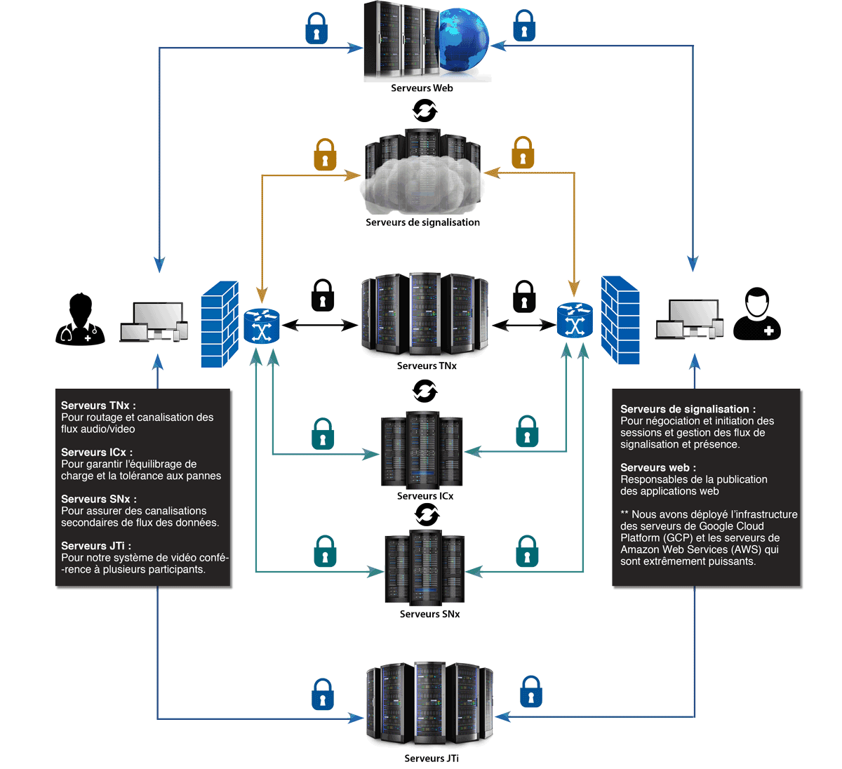 Syndoxis TLM Déploient des serveurs audio/video stun/turn et des servers de signalisation distribués dans 5 continents et capables de gérer avec aisance des appels audio/vidéo depuis et à destination de toutes locations autour du monde.