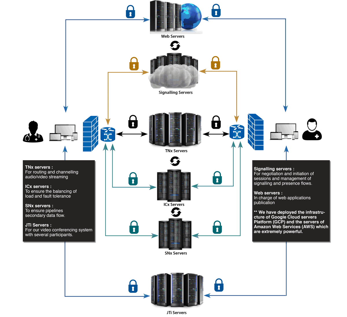 Syndoxis TLM deploys audio/video stun/turn servers and signaling servers distributed in 5 continents and capable of handling audio/video calls from and to any location around the world with ease.